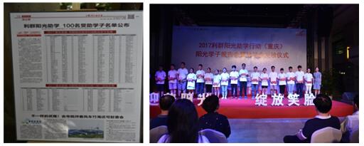 2017年8月18日下午,2017利群陽光助學行動(重慶)學子報告會暨助學金發放儀式在重慶渝澳國際藝術中心舉行。全國人大原常委、重慶市人民政府原副市長程貽舉,浙江中煙工業有限責任公司市場營銷部副總經理馬秋蓮,重慶晨報負責人,共青團沙坪壩區委書記王韻,重慶市大愛渝商慈善基金會副理事長李軍亞,愛心企業代表重慶洋世達(實業)集團有限公司行政人事總監陳靜等嘉賓出席本次活動。活動中,與會嘉賓為151名來自永川、銅梁、大足、涪陵、奉節等區縣的每位陽光學子頒發了5000元愛心助學金、暖心的新書包和一件白色T恤衫。